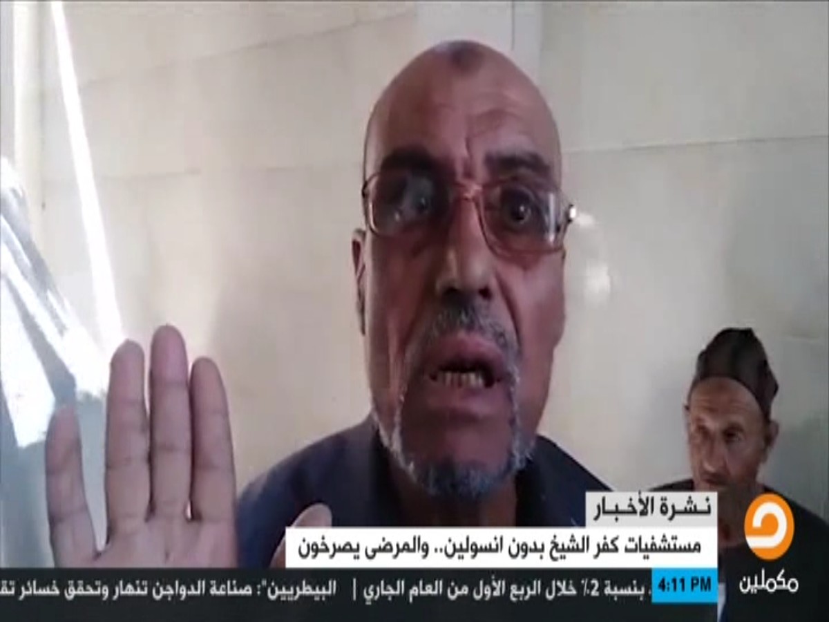 وقال أحد الأهالي، في تصريح لقناة “مكملين”: إنهم يعانون من نقص العلاج منذ شهرين، وقدموا شكوى لمدير المستشفى ولم يحرك ساكنا، وطالبنا بعمل فاكسات لوزارة الصحة”.