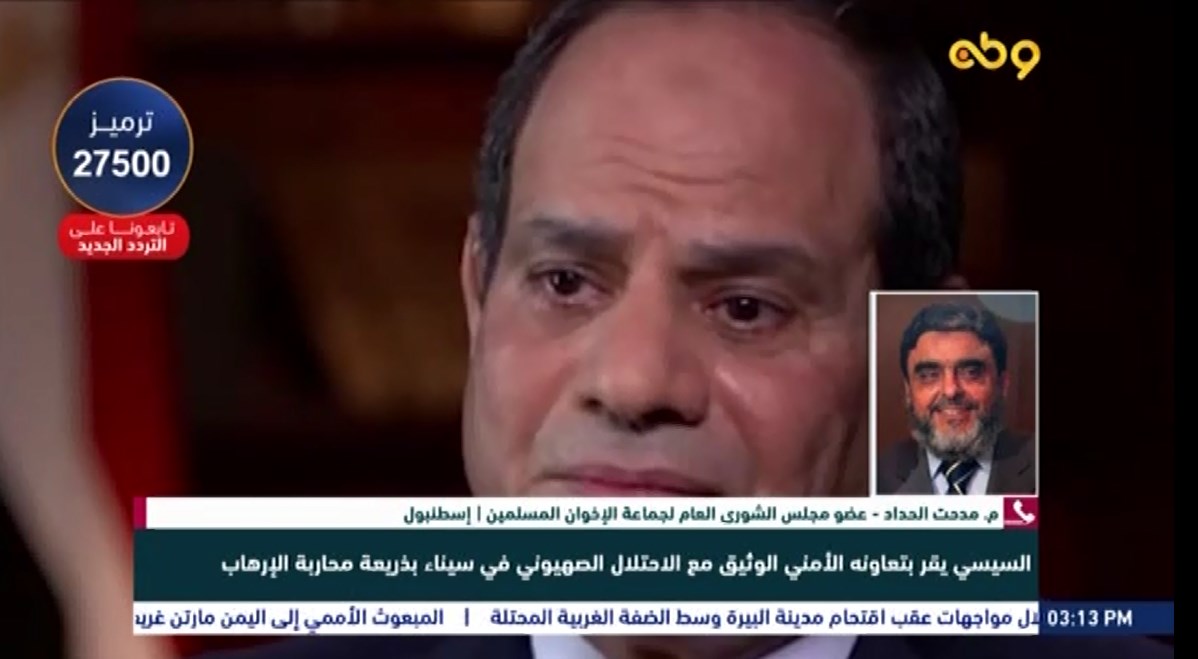 وأكد الحداد أن الجماعة تدرس جيدا شريط مقابلة السيسي مع القناة الأمريكية لتحديد كيفية الاستفادة منه؛ لأن السيسي اعترف بارتكاب جرائم يحاكم علها القانون الدولي والمحكمة الجنائية الدولية.
