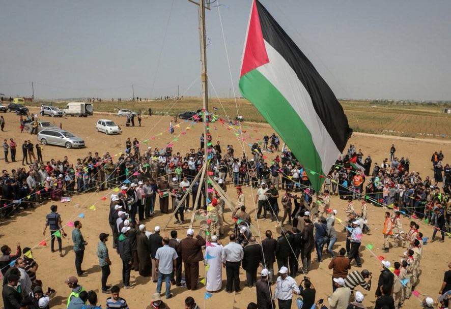 وفي وقت مبكر تجمع فلسطينيون على حدود غزة ورفعوا علم فلسطين فوق أعلى سارية هناك، متحدّين رصاص جنود الاحتلال.