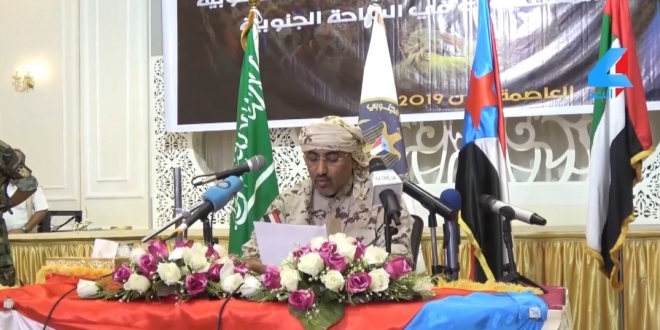 وفي كلمته التي ألقاها مساء السبت أمام الاجتماع الموسع الثاني لقيادات ما يعرف بالمقاومة الجنوبية بكافة تشكيلاتها الأمنية والعسكرية في عموم محافظات الجنوب لم يذكر عيدروس الزبيدي رئيس المجلس الانتقالي الجنوبي المدعوم إماراتيا الحكومة الشرعية في اليمن الذي يقول تحالف الرياض أبوظبي إنه جاء لتثبيت شرعيتها، وأعلن التعبئة للسيطرة على وادي حضر موت الذي تسيطر عليه قوات المنطقة العسكرية الأولى التابعة للحكومة الشرعية.