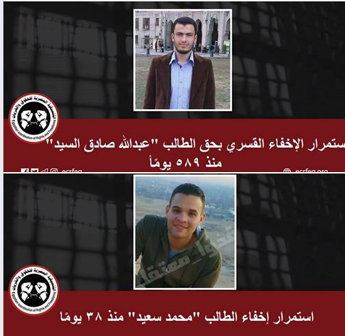 كما وثقت المنظمة استمرار الإخفاء القسري لطالبين منذ اختطافهما من داخل الجامعة أحدهما من جامعة بني سويف والثاني من جامعة الأزهر لمدد متفاوتة ضمن جرائم العسكر ضد الإنسانية.