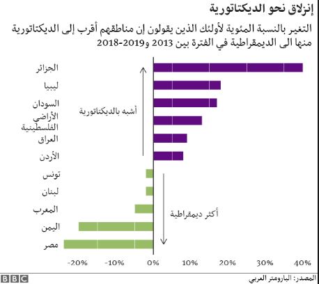 كان البارومتر العربي قد توصل في عام 2013 إلى أن سكان الجزائر والأردن والعراق هم الأكثر ترجيحًا لاعتبار بلدانهم أقرب إلى الديمقراطية من الديكتاتورية.