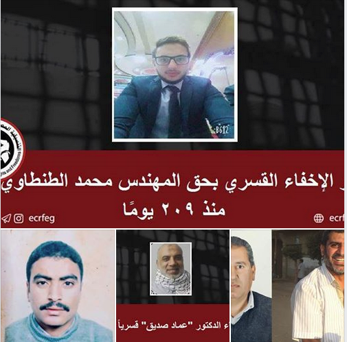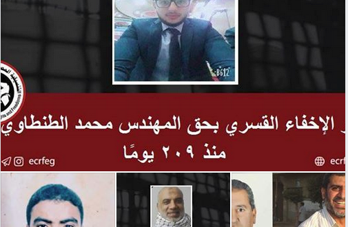 كما وثقت المنظمة استمرار الجريمة ذاتها للمهندس "محمد الطنطاوي حسن حسن”، 26 عامًا، لليوم الـ209 على التوالي، وذلك منذ القبض التعسفي عليه يوم 5 فبراير الماضي، من شارع 9 بالمقطم فى القاهرة دون سند قانوني، واقتياده لجهة مجهولة حتى الآن.