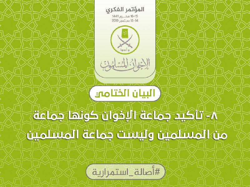أوصت جماعة الإخوان المسلمين، بمشاركة 500 مفكر (عالم وباحث وداعية ومفكر إسلامي) من 20 دولة، في بيانها الختامي المنبثق عن مؤتمرهم الذي أتمّ أول أمس فعالياته التي استمرت على مدى يومي السبت والأحد 15-16 محرم 1441هـ، الموافق 14-15 سبتمبر 2019م، بتمسك شعوب الأمة الإسلامية بحقها في التحرر من قبضة الطغيان والاستبداد، واختيار حكامها عبر آليات ديمقراطية ترتضيها وتتوافق عليها.