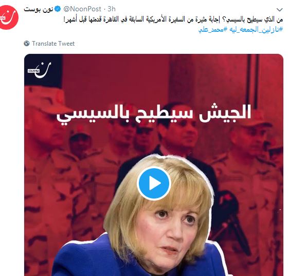 من الذي سيطيح بالسيسي؟ إجابة مثيرة من السفيرة الأمريكية السابقة في القاهرة قدمتها قبل أشهر!#نازلين_الجمعه_ليه #محمد_علي pic.twitter.com/fuqEj7wUM7
