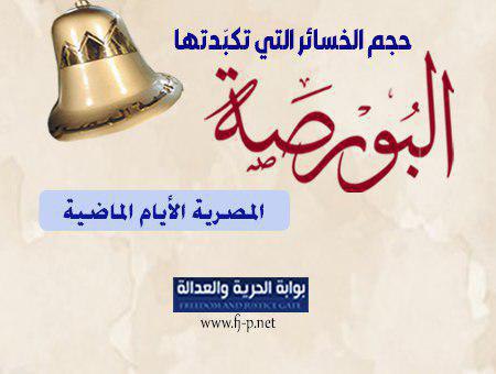 شهدت البورصة خلال الأيام الأخيرة الماضية خسائر فادحة بلغت 64 مليار جنيه، وذلك إثر مخاوف المستثمرين من المظاهرات التي انطلقت وتزايدت بصورة كبيرة، بعد أن فضح مقاول الجيش محمد على، إهدار قائد الانقلاب عبد الفتاح السيسى عشرات المليارات لإنشاء القصور الرئاسية.. والتفاصيل فى الجراف التالى: