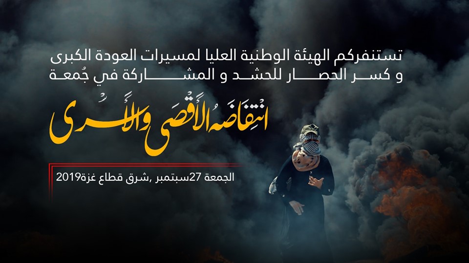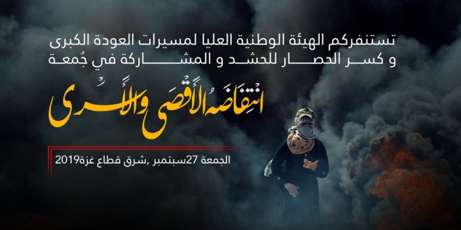 ودعت الهيئة الوطنية العليا لمسيرات العودة وكسر الحصار – في بيان صحفي – جماهير الشعب الفلسطيني للمشاركة في هذه الجمعة التي تحمل شعار "جمعة #انتفاضة_الأقصى_والأسرى"، وذلك على أرضِ مخيماتِ العودةِ شرقَ القطاع؛ حيث تنطلق الفعاليات عقب صلاة العصر مباشرة.