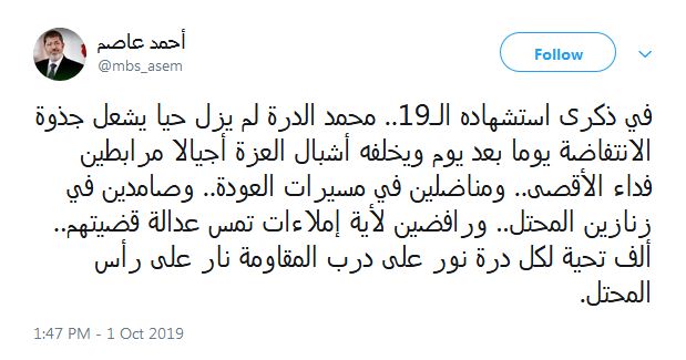 وقال أحمد عاصم، المتحدث الإعلامي بإسم جماعة الاخوان المسلمين، عبر حسابه على تويتر: "في ذكرى استشهاده الـ19.. محمد الدرة لم يزل حيا يشعل جذوة الانتفاضة يوما بعد يوم ويخلفه أشبال العزة أجيالا مرابطين فداء الأقصى.. ومناضلين في مسيرات العودة.. وصامدين في زنازين المحتل.. ورافضين لأية إملاءات تمس عدالة قضيتهم.. ألف تحية لكل درة نور على درب المقاومة نار على رأس المحتل".