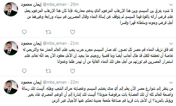 وأضافت محمود: "لقد فاق نزيف الدماء في مصر كل تصور. لقد صار السيسي مجرم حرب يجب على العالم الحذر منه والتربص له خاصة أن تعطشه للقتل قد طال أجانب أيضا وما قضية روجيني منا ببعيد. إن الأمل معقود الآن بعد الله تعالى على استمرار المصريين في ثورتهم من أجل حقن تلك الدماء الغالية من أن تهدر ظلما وعدوانا".
