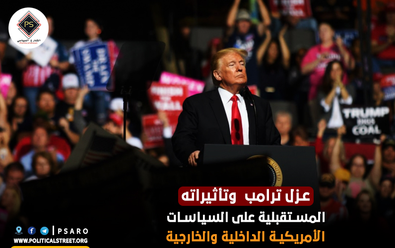 في دراسة تحليلية اعدتها صفحة "الشارع السياسي" حول "عزل ترامب وتأثيراته المستقبلية على السياسات الأمريكية الداخلية والخارجية" تناولت الانعكاسات السياسية عى الشرق الأوسط وقضاياه، ازاء قضية عزل ترامب، متوقعة ان يخرج ترامب من أزمته ضعيفا، أو يفقد منصبه خلال الانتخابات المقبلة في نوفمبر 2020 على أقل تقدير.