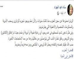 كشفت السيدة سناء عبد الجواد، زوجة الدكتور محمد البلتاجي المعتقل في سجون الانقلاب، عن تجريد إدارة سجن العقرب زنازين المعتقلين من الأغطية والأدوية والمستلزمات الشخصية.