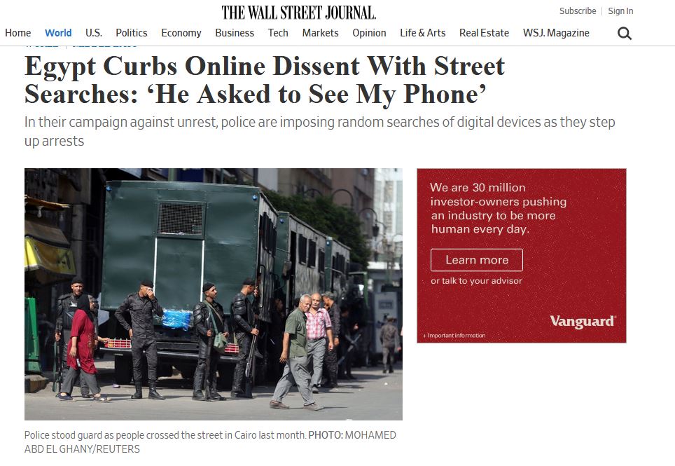 وعمّا يجري قالت، إن الشرطة في القاهرة وغيرها من المدن توقف المواطنين أثناء سيرهم للتحقق مما إذا كانت لديهم مواقع تشترك في انتقاد السيسي أو تقوم بنشر معلومات حول الاحتجاجات، كما أفاد كثير ممن خضع لعمليات التفتيش تلك، وبما أثبتته جماعات حقوق الإنسان.