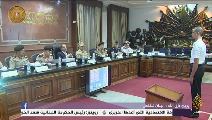 وصرّح السفير بسام راضي، المتحدّث باسم رئاسة الجمهورية المغتصبة، بأنّ السيسي ناقش خلال متابعته لإجراءات اختبارات الهيئة عددًا من الطلبة المتقدمين في بعض القضايا والموضوعات التي تُدار على الساحتين الداخلية والخارجية، بالإضافة إلى بعض المعلومات العامة عن تاريخ مصر وما شهدته من نهضة تنموية في مختلف المجالات.