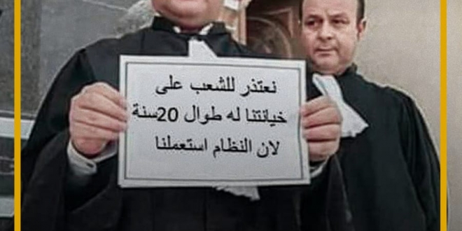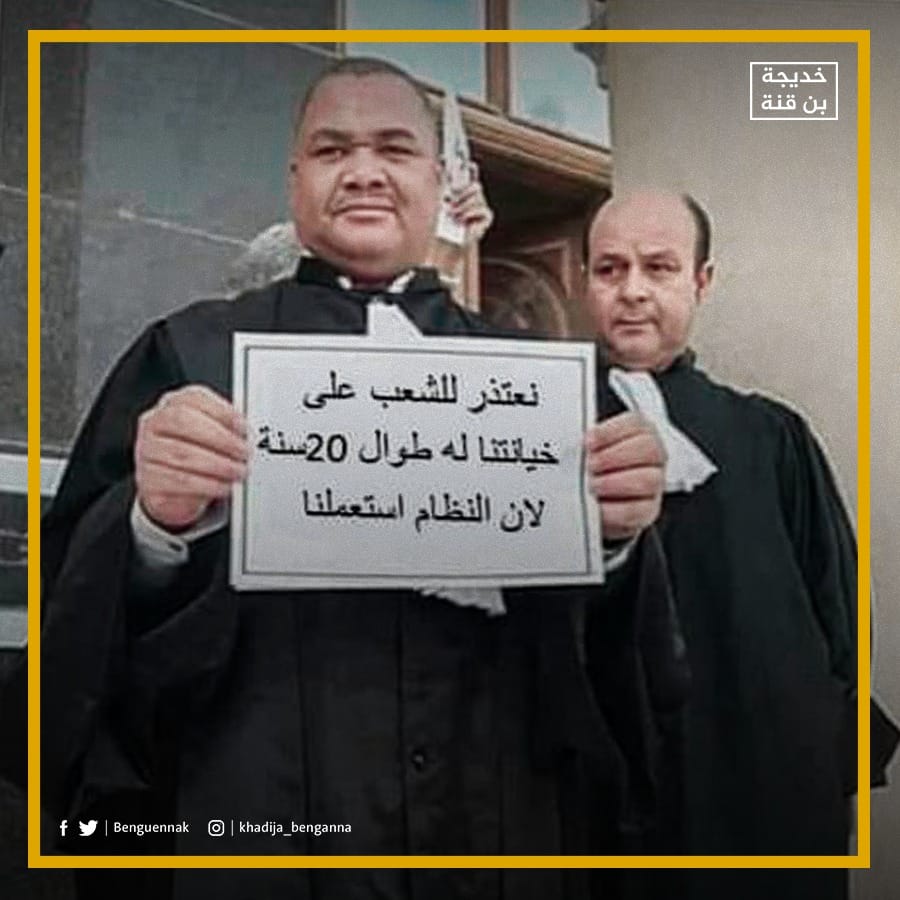 وتداول عدد من مستخدمى مواقع التواصل الاجتماعى، صورة لقضاة الجزائر الذين يعتذرون للشعب عما بدر منهم، حيث ظهر فى الصورة قاضيان يحملان ورقة مطبوعًا عليها: نعتذر للشعب على خيانتنا طوال 20 سنة لأن النظام استعملنا”.