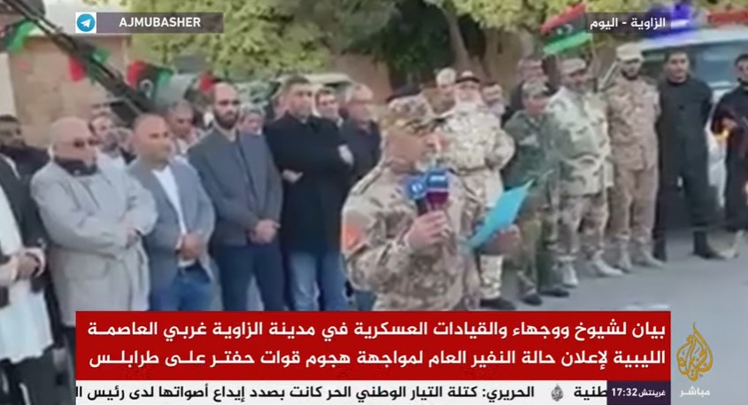 أعلنت السلطات المحلية في كل من مصراتة وزليتين حالة النفير القصوى، وإرسال كل القوات المشاركة في عملية الدفاع عن العاصمة طرابلس، التي تتعرض لحملة عسكرية من قوات حفتر، تستهدف بدعم إماراتي مصري حكومة الوفاق المعترف بها دوليًّا.