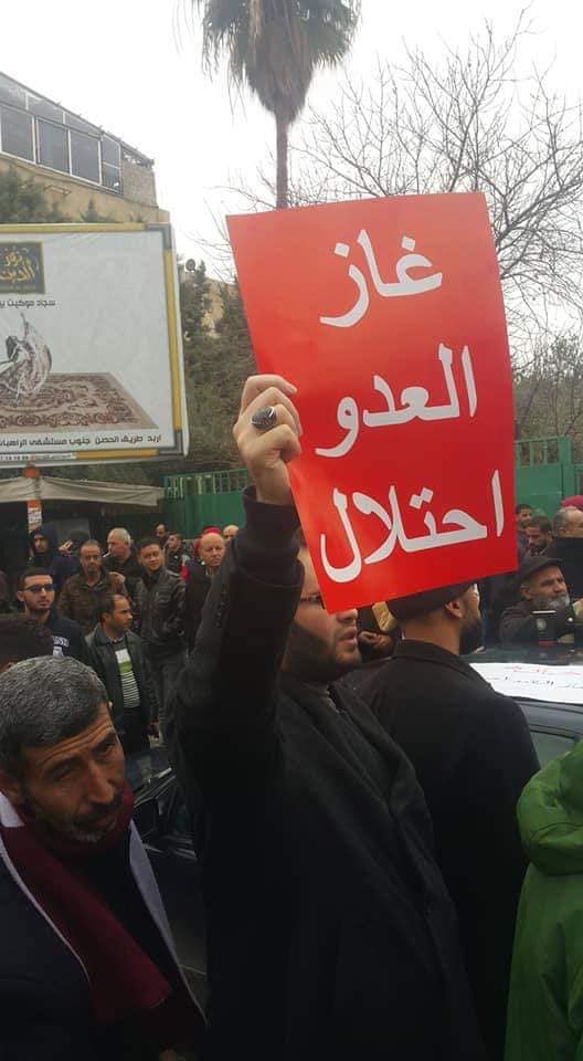شارك الآلاف من الأردنيين، في سلسلة تظاهرات، اليوم الجمعة، للمطالبة بإسقاط اتفاقية الغاز مع الاحتلال ومحاسبة المسئولين عن توقيعها، وذلك استجابة لدعوة الحملة الوطنية لإسقاط اتفاقية الغاز مع الكيان الصهيوني، ضمن ما أسمتها "جمعة المحافظات" في محافظات العقبة والكرك والزرقاء وإربد.