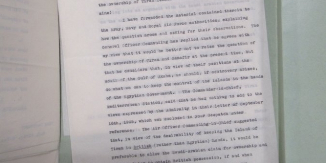 ونشر باحث، يدعى رامي شاهين، صورة لأوراق إنجليزية قال إنها وثيقة من الأرشيف الوطني البريطاني تقول: “اقترح القائد العام للقوات الجوية أنه بالنظر إلى استصواب إبقاء جزيرة تيران في أيدي البريطانيين (وليس المصريين)، سيكون من الأفضل السماح للمطالبة السعودية العربية بالملكية”.