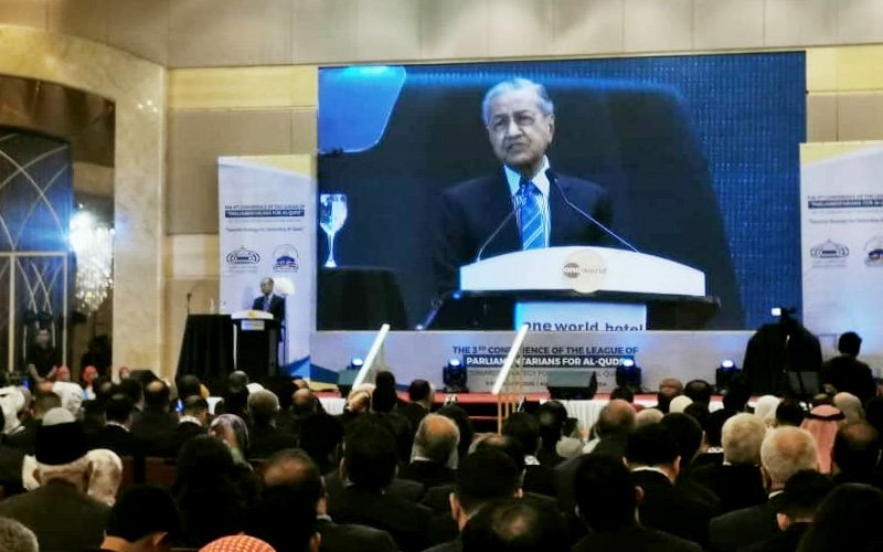 وفي كلمته قال رئيس الوزراء الماليزي إن خطة ترامب المزعومة للسلام بين الاحتلال الإسرائيلي والفلسطينيين «جائرة وغير مقبولة». مضيفا أن «صفقة القرن» المقترحة من جانب الرئيس الأميركي دونالد ترامب، تقدم مدينة القدس للجانب الإسرائيلي «على طبق من فضة»، في تجاهل تامٍ لمشاعر ملايين المسلمين والمسيحيين حول العالم.