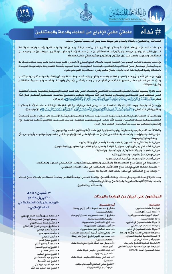 وطالب البيان ضمن إطلاق سراح المعتقلين في سجون بلاد العرب بلا استثناء، بـ”ممارسة الضغط الدولي، لإطلاق سراح كافّة الأسرى والمعتقلين في سجون الاحتلال الصهيوني”. ووقع على البيان العديد من العلماء العرب وغير العرب.