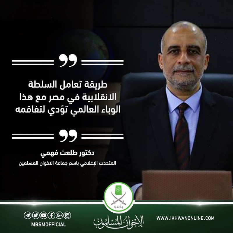 قال المتحدث الإعلامي لجماعة الإخوان المسلمين د. طلعت فهمي: إن طريقة تعامل السلطة الانقلابية في مصر مع وباء كورونا تؤدي إلى تفاقم الفيروس.
