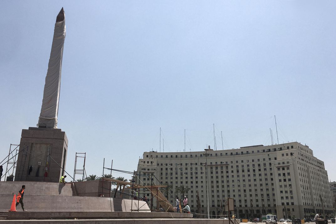 وتظهر المسلة التي يبلغ ارتفاعها 55 قدمًا في وسط ميدان التحرير، بعد أن ثبتتها ورممتها حكومة الانقلاب في فبراير الماضي، قادمة بالأساس من صان الحجر بمحافظة الشرقية.