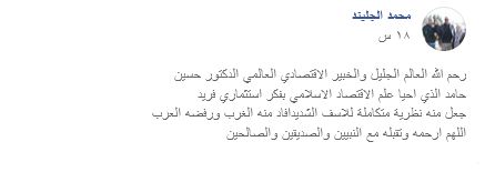 ونعاه الأكاديمي د.محمد الجليند فكتب عبر حسابه قائلا "رحم الله العالم الجليل والخبير الاقتصادي العالمي الدكتور حسين حامد الذي احيا علم الاقتصاد الاسلامي بفكر استثماري فريد .. جعل منه نظرية متكاملة للاسف الشديدافاد منه الغرب ورفضه العرب .. اللهم ارحمه وتقبله مع النبيين والصديقين والصالحين".