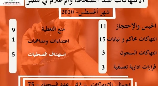 أكد المرصد العربي لحرية الاعلام استمرار الانتهاكات الصارخة بحق الصحفيين والإعلاميين في مصر، بينها القبض وإعادة تدوير المعتقل منهم على قضايا جديدة وغيرها من الانتهاكات التى رصدها المركز فى تقريره عن شهر أغسطس المنقضى 2020.