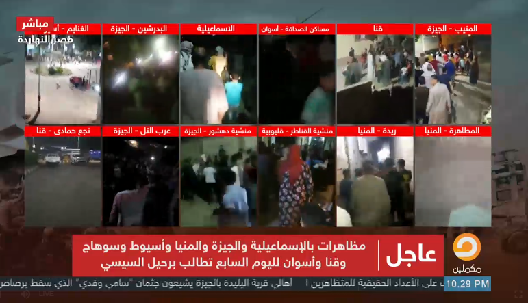 مع بدء مظاهرات اليوم السابع منذ انتفاضة 20 سبتمبر الجاري انطلقت اليوم السبت ليلا 16 مظاهرة بـ8 محافظات تطالب برحيل السيسى، وتندد بجرائمه والظلم الذى طال الجميع.