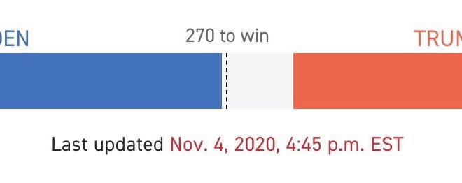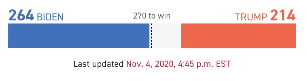 ووصل بايدن إلى الرقم 264 في مقابل 214 صوتا لترامب. يأتي ذلك وسط توتر شديد واحتقان في الشارع الأمريكي ومظاهرة رافضة لترامب في نيويورك، واتهامات من ترامب وحملته بتزوير الانتخابات في العديد من الولايات ومطالب بإعادة الفرز فيها.