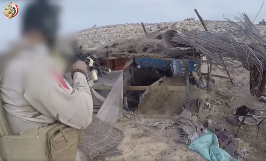 ويظهر إطلاق النار على الخيمة جنديا يستخدم بندقية من طراز إم 4 مع ضوء موجه (PEQ) ومدفع ضوئي قتالي متقدم، وكلاهما من صنع الولايات المتحدة، مما يثير أسئلة جديدة حول صادرات الأسلحة إلى مصر من قبل الولايات المتحدة ودول أخرى.