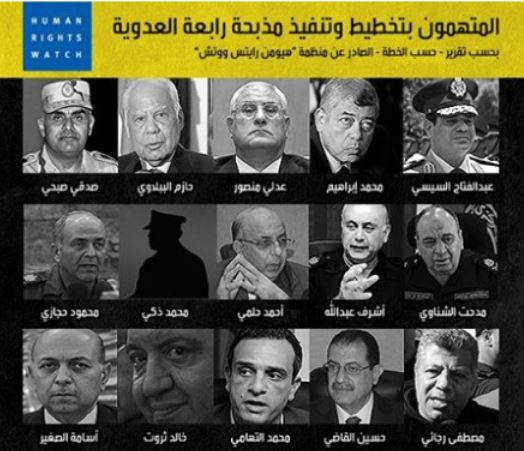 كانت تلك فقرة في ثنايا تقرير من عشرات الفقرات التي تدين عبدالفتاح السيسي وعصابة الانقلاب عن فض رابعة العدوية ونهضة مصر متهمة لهم بارتكاب مجزرة، ويتبرأون من فعل الإجرام الدموي الذي تورط فيه الجيش إلى جوار الشرطة والبلطجية بحق الاعتصامات السلمية الديمقراطية".