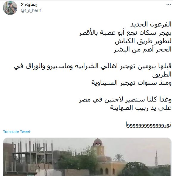 المجلس الثوري المصري وعبر حسابه على التواصل قال إن "الخوف أن يلي تلك المصيبة تهجير الأهالي وبيع المنطقة للإمارات لعمل مشاريع".