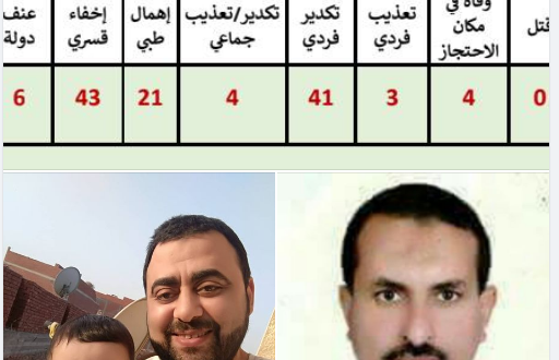 يضاف إليها 21 حالة إهمال طبي و43 حالة إخفاء قسري و 3 حالات تعذيب فردي و41 حالة تكدير جماعي و4 حالات تعذيب جماعي و6 حالة لعنف الدولة.