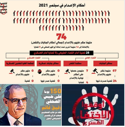 وأشارت المبادرة إلى أنه لم يتم رصد تنفيذ أي أحكام للإعدامات خلال شهر سبتمبر سواء من المحاكم المدنية أو العسكرية كما أن أحكام الإعدامات الصادرة في سبتمبر اقتصرت على محاكم الجنايات والنقض دون المحاكم العسكرية.