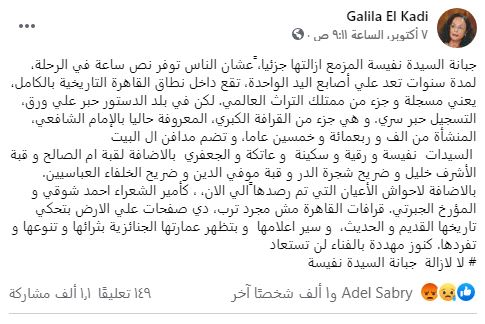 وأوضحت في منشور سابق أن "جبانة السيدة نفيسة المزمع ازالتها جزئيا، لأجل توفير نصف ساعة في الرحلة، لمدة سنوات تعد على أصابع اليد الواحدة، تقع داخل نطاق القاهرة التاريخية بالكامل، يعني مسجلة و جزء من ممتلك التراث العالمي، لكن في بلد الدستورفيها حبر على ورق، التسجيل حبر سري، و هي جزء من القرافة الكبرى، المعروفة حاليا بالإمام الشافعي، المنشأة من ألف و أربعمائة و خمسين عاما، و تضم مدافن آل البيت السيدات نفيسة و رقية و سكينة و عاتكة و الجعفري بالإضافة لقبة أم الصالح و قبة الأشرف خليل و ضريح شجرة الدر و قبة موفي الدين و ضريح الخلفاء العباسيين، بالإضافة لأحواش الأعيان التي تم رصدها إلى الآن، ، كأمير الشعراء أحمد شوقي و المؤرخ الجبرتي، قرافات القاهرة ليست مجرد ترب، هذه صفحات على الأرض تحكي تاريخها القديم و الحديث، و سير أعلامها، و تُظهر عمارتها الجنائزية بثرائها و تنوعها و تفردها كنوزا مهددة بالفناء لن تُستعاد".
