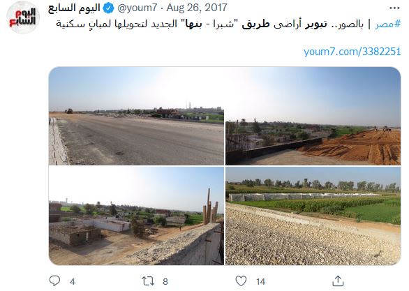 وفي صيف 2017، أعلنت صحف محلية في أغسطس من هذا العام قرارا من حكومة السيسي بتبوير أراضي طريق "شبرا – بنها" الجديد لتحويلها لمبانٍ سكنية تبوير الأراضي الزراعية حول طريق شبرا ـ بنها الجديد.