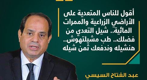 في سبتمبر الماضي، قال السيسي "كل التعديات على الأراضي الزراعية والترع في آخر ٣٠ سنة سيتم إزالتها خلال ٦ شهور  وسيتم وقف أي دعم مقدم من الحكومة لمن يتعدى على الترع والجسور والأراضي الزراعية وأراضي الدولة لحين إزالة تعديه".