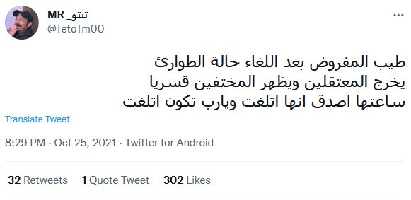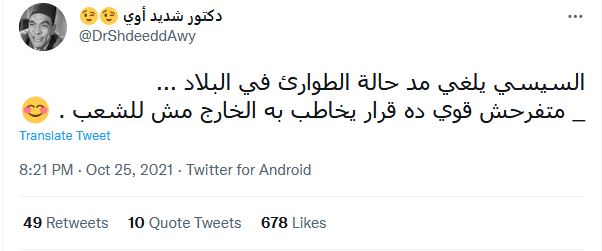 وتحدث الإعلامي أحمد عطوان  @ahmedatwan66 عن أهداف غير بريئة للسيسي فرأى كما يرى النائم أن "قرار السيسي بإنهاء العمل بقانون الطوارئ سيستفيد منه كافة المعتقلين السياسيين، ويحد من سيولة الأحكام القضائية المسيسة الصادرة من محاكم الطواريء، بعيدا عن أهداف القرار الغير بريئة وارتباط توقيته بانقلاب السودان وتحسين الصورة للفوز بمقابلة بايدن بقمة المناخ في جلاكسو الأسبوع القادم".