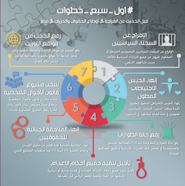 ودعت حركات منها حركة 6 إبريل إلى خطوات سبعة لبرهنة إلغاء الطوارىء فعليا. أما الإعلامي حمزة زوبع @drzawba فقال "النظام في مصر مطالب الآن وفورا بالآتي":