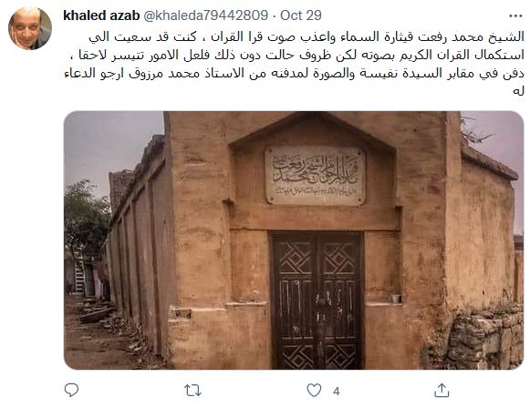 وعن سبب إشارته للضريح ألمح إلى أنه دخل ضمن خطة النزع فقال "الضريح فيه من الداخل تفاصيل زخرفية مميزة بجانب خطوط عربية مميزة والفلسفة التصميمية للضريح تعتبر حلقة مهمة في فهم تطور الطراز الإسلامي المستحدث اللي كان انتشاره جزء من سجال الأفكار المتدوال في مصر في أول القرن العشرين ، وطبعا مش محتاج أقول أنا بكتب البوست ده ليه كلكم نظر".