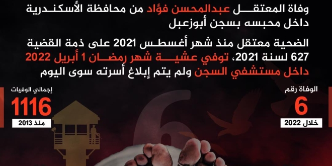 يشار إلى أن هذه هي الحالة السادسة لوفاة معتقل داخل السجون نتيجة الإهمال الطبي المتعمد منذ مطلع العام الجاري ضمن مسلسل الجرائم التي لا تسقط بالتقادم.