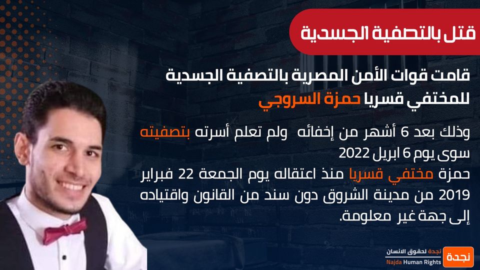 وقالت المنظمة إن قوات الانقلاب قامت بالتصفية الجسدية للمختفي قسريا حمزة أحمد سيد محمد السروجى الطالب بكلية الدراسات الإسلامية بجامعة الأزهر بعد 6 أشهر من إخفائه ولم تعلم أسرته بتصفيته سوى أمس الأربعاء 6 إبريل.