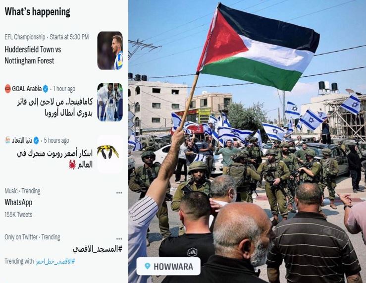 تصدر وسم #المسجد_الأقصى الأعلى تداولا على مواقع التواصل الاجتماعي "فيسبوك" و"تويتر" مصريا وفي الوطن العربي بعد إصرار الكيان الصهيوني بدعم همج المستوطنين لاقتحام منظم لباحات وساحات المسجد الأقصى المبارك وأداء طقوس وصلوات تلمودية بشكل جماعي ورفع الأعلام الصهيونية.