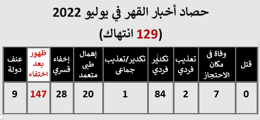 رصد أرشيف القهر لشهر يوليو المنقضي 2022 الصادر عن مركز النديم لمناهضة العنف والتعذيب 129 انتهاكا متنوعا وظهور 147 من المختفين قسريا لفترات متفاوتة أثناء عرضهم على نيابة أمن الدولة العليا.