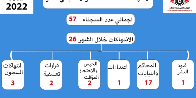 ووثق المرصد 26 انتهاكا متنوعا في تقريره لانتهاكات حرية الإعلام في مصر خلال شهر يوليو 2022 مع استمرار حبس 57 صحفيا وصحفية .