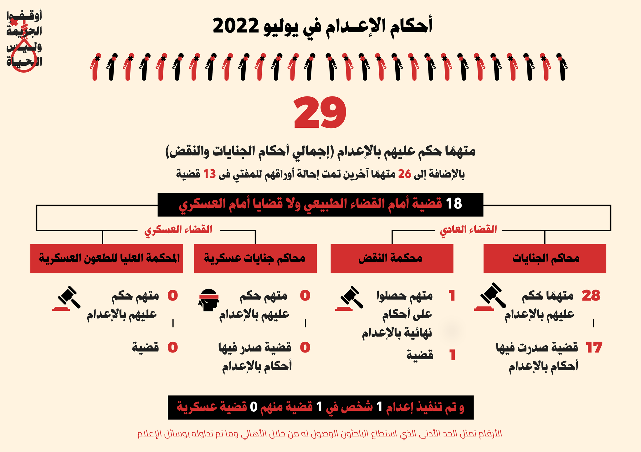 فيما رصدت المبادرة المصرية للحقوق الشخصية صدور أحكام بإعدام 29 مواطنا خلال شهر يوليو الماضي في 18 قضية ، فضلا عن إحالة أوراق 26 آخرين للمفتي لأخذ الرأي في إعدامهم في 13 قضية أخرى .