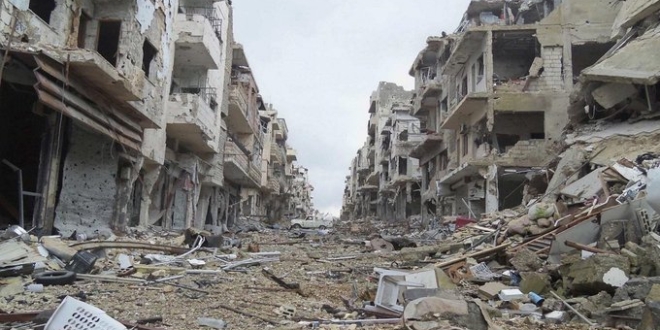 (أولها)  محاولة الدعاية بأن هذه المدن تدمرت بفعل الارهاب في إشارة لكفاح الشعب السوري ضده، لا بسبب قصف جيشه والجيش الروسي والمرتزقة لهذه المدن.