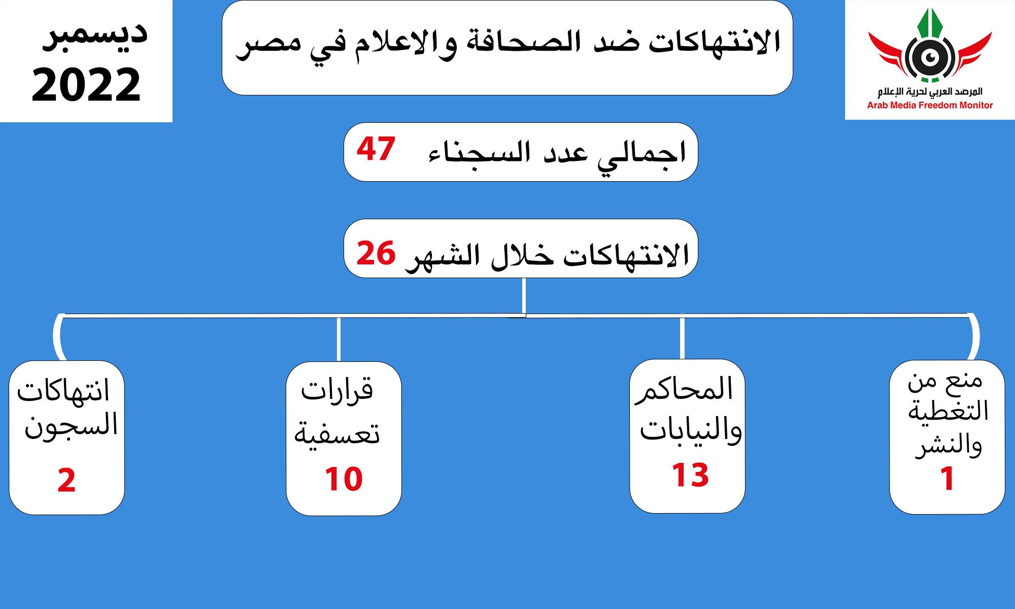 وثق المرصد العربي لحرية الإعلام 26 انتهاكا في تقريره انتهاكات عن حرية الصحافة والإعلام في مصر لشهر ديسمبر المنقضي لعام ٢٠٢٢ واستمرار حبس 47 صحفيا وصحفية. حيث جاء على رأس الانتهاكات المحاكم والنيابات بـ(١٣) انتهاكا، ثم القرارات الإدارية التعسفية بـ(١٠ انتهاكات)، ثم انتهاكات السجون بـ(انتهاكين) ثم المنع من النشر بانتهاك واحد.