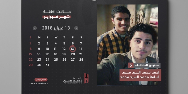 فيما جددت حملة أوقفوا الاختفاء القسري المطالبة بالكشف عن مصير الشقيقين “أحمد محمد السيد محمد السواح ” و “أسامة محمد السيد محمد السواح “من أبناء مركز الحسينية محافظة الشرقية بالتزامن مع مرور 5 سنوات على جريمة إخفائهم قسريا بعد اعتقالهم تعسفيا بتاريخ 13 فبراير 2018 .