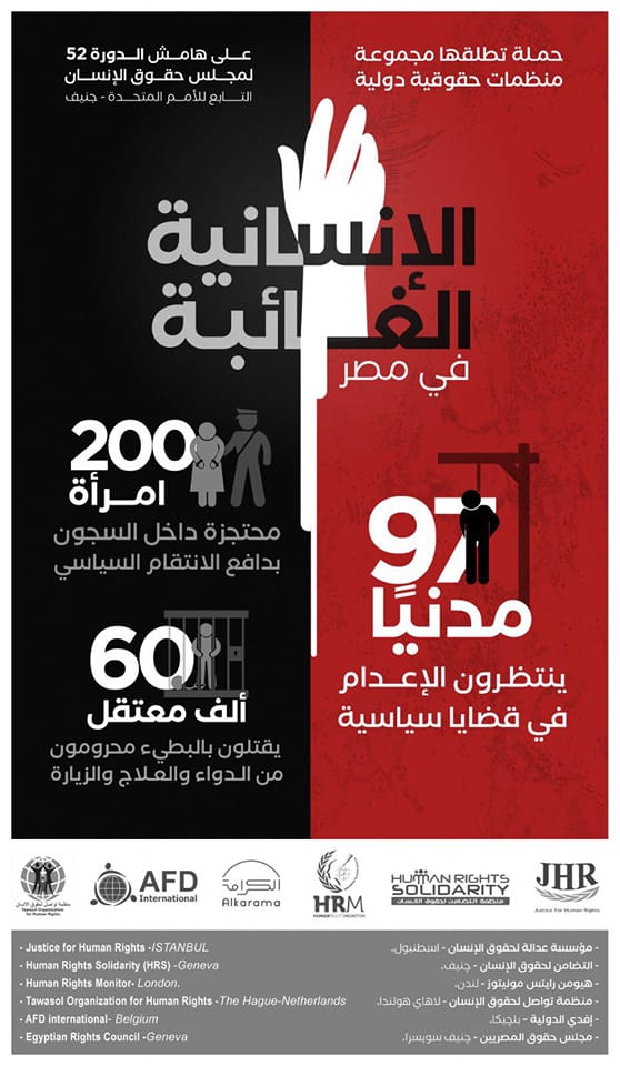 أطلقت  مجموعة منظمات حقوقية دولية حملة بعنوان “الإنسانية الغائبة في مصر”على هامش الدورة 52 لمجلس حقوق الإنسان التابع للأمم المتحدة – جنيف ، خلال الفترة من 27 فبراير الجاري وحتى 4 مارس المقبل.
